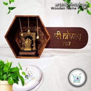 intricate carvings, layered wooden textures, and decorative hanging bells give the design a royal spiritual appearance, making it a unique centerpiece for your home entrance. Expertly designed and manufactured by artsnprints.com, this nameplate ensures durability, refined finishing, and long-lasting beauty that enhances the identity of your home.