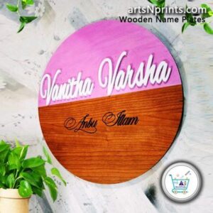 Add a stylish and vibrant touch to your home entrance with the “Vanitha Varsha” round designer wooden name plate, beautifully crafted by artsnprints.com.